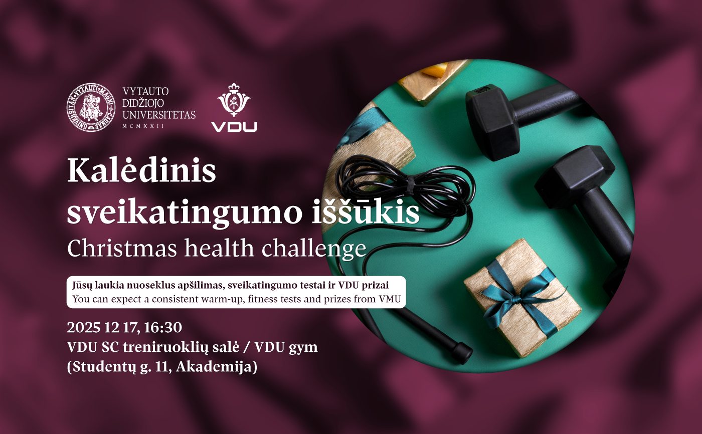 Vytautas Magnus University community is invited to the winter season event “Christmas VMU Health Challenge 2025”, which will take place on December 17 (Wednesday) at 4:30 p.m. in the training hall of the VMU Sports Center (Studentų g. 11, Akademija, Kaunas district).