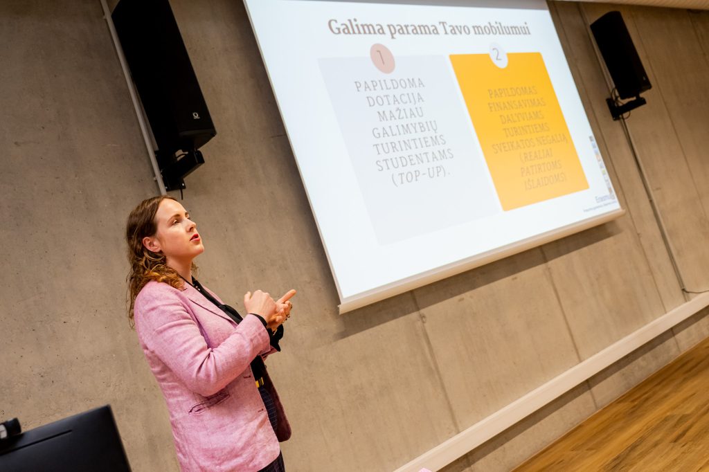 Monika Skaringaitė, Head of the Higher Education Mobility Projects Department at the Education Exchanges Support Foundation, highlighted in her presentation the additional financial support opportunities available to students with disabilities or special needs, encouraging them to take advantage of the offered assistance, including travel and living expense reimbursements, coverage for accompanying persons, and more.