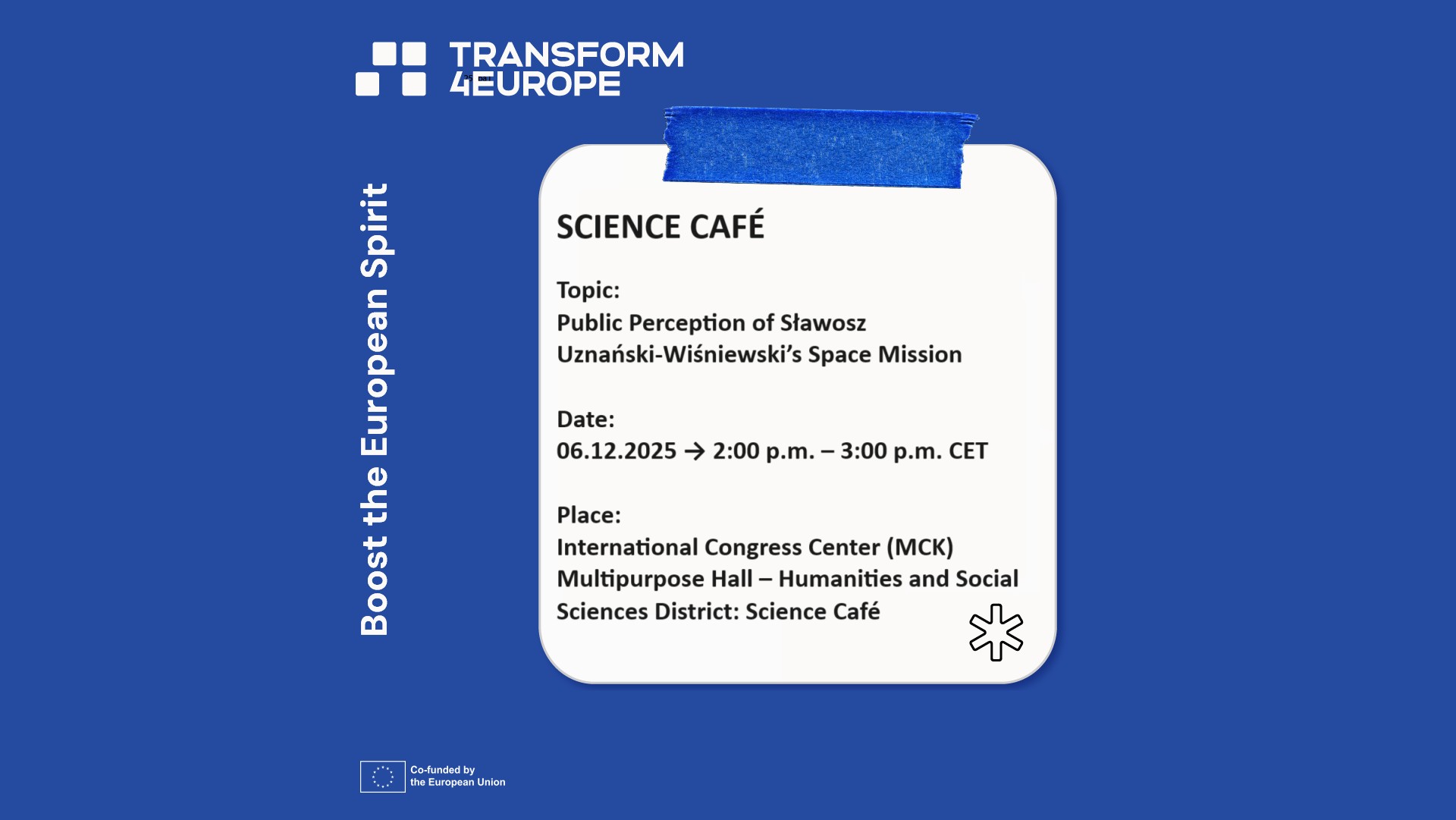 On Saturday 6 December, at 3–4 pm (EET), the Transform4Europe Alliance invites students and university staff to participate in another Science Café event. As part of Silesian Science Festival, a discussion will be held on Social Perception of the Space Mission of Sławosz Uznański-Wiśniewski. The event will be hosted online and at the International Congress Centre in Katowice, Poland.