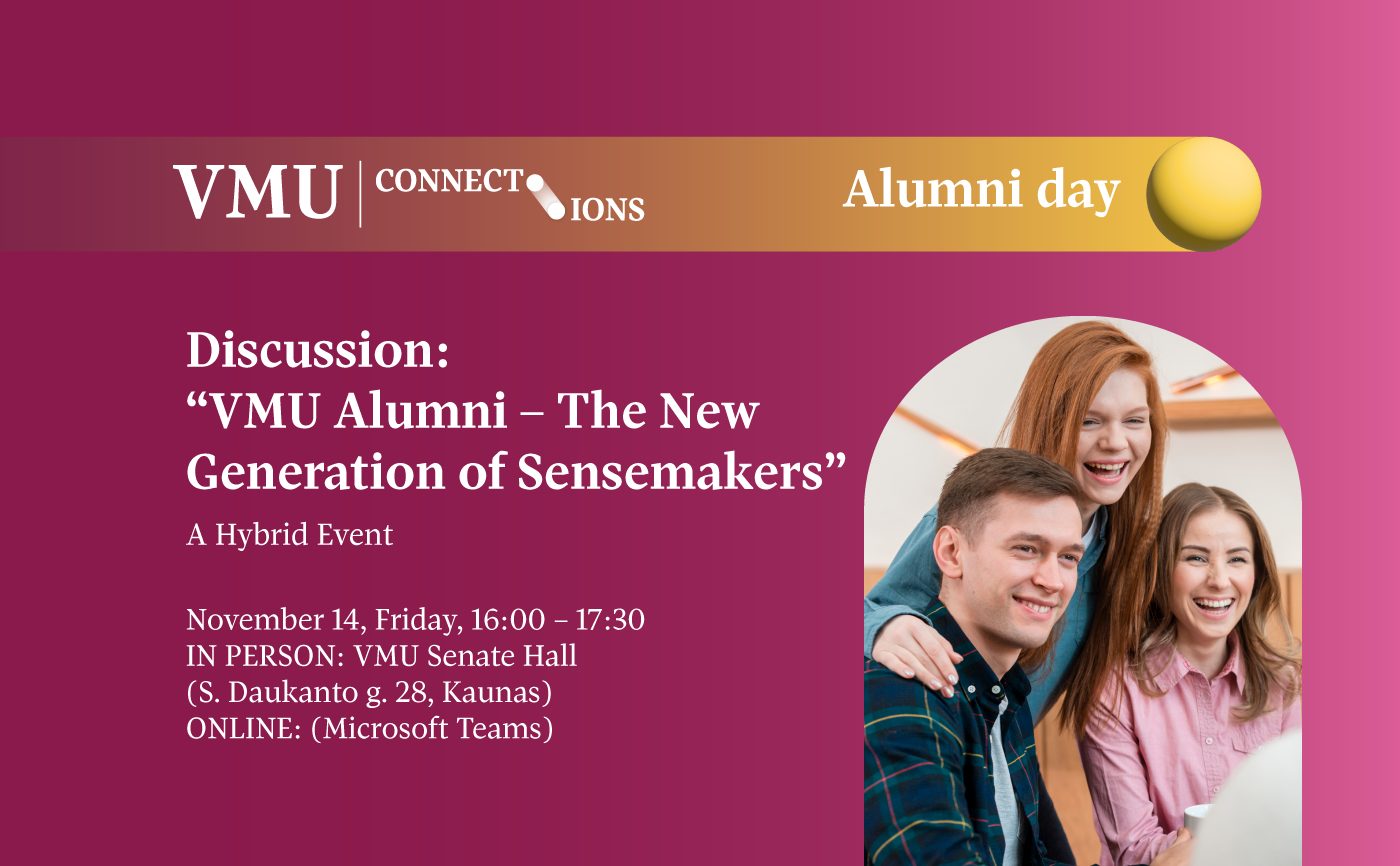 On Friday, November 14th, from 4 p.m. to 5.30 p.m., a hybrid discussion titled VMU Alumni – The New Generation of Sensemakers will be held online (via MS Teams) and on-site at VMU Senate Hall (28 S. Daukanto g., Kaunas). The discussion will take place on Vytautas Magnus University’s traditional Alumni Day, hosted as part of the VMU Connections Event. Registration is required.