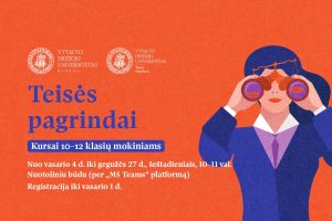 VDU Teisės fakultetas kviečia bendrojo lavinimo mokyklų 10-12 klasių mokinius dalyvauti nemokamuose universitetiniuose kursuose „Teisės pagrindai“, kuriuose moksleiviai galės susipažinti su visomis pagrindinėmis teisės šakomis ir teisine sistema.