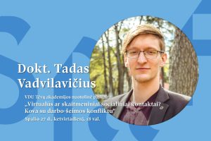 Spalio 27 d. (ketvirtadienį), 18 val., VDU Tėvų akademija kviečia dalyvauti nuotolinėje paskaitoje „Virtualūs ar skaitmeniniai socialiniai kontaktai? Kova su darbo-šeimos konfliktu“. Paskaitą ves VDU Psichologijos katedros doktorantas Tadas Vadvilavičius.
