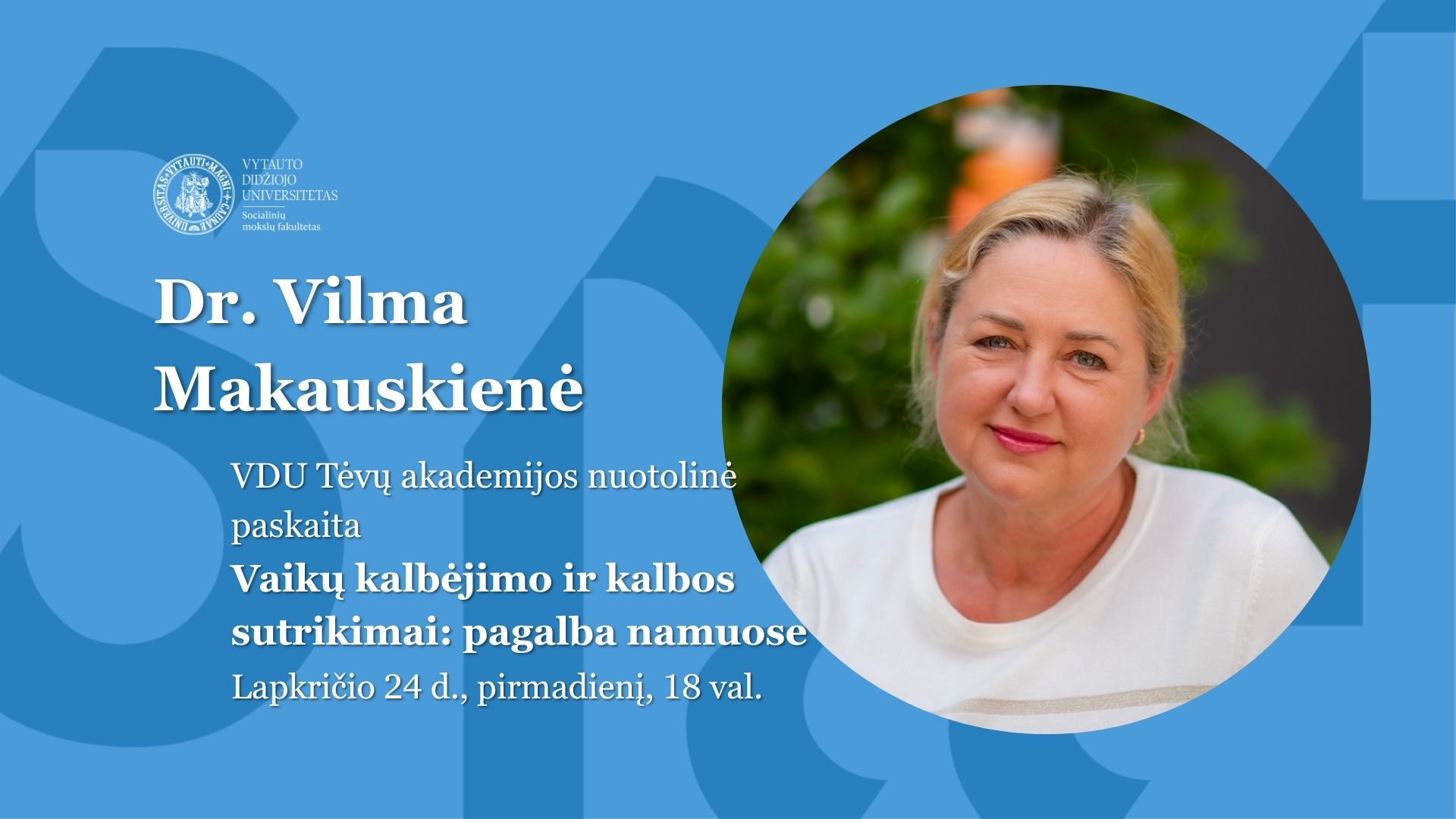 Paskaitą ves Vytauto Didžiojo universiteto Švietimo akademijos dėstytoja, logopedė, psichologė, VšĮ „Logopedinės pagalbos centras“ vadovė ir knygų autorė dr. Vilma Makauskienė.