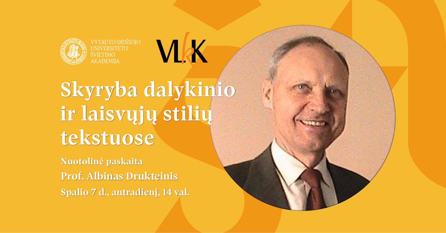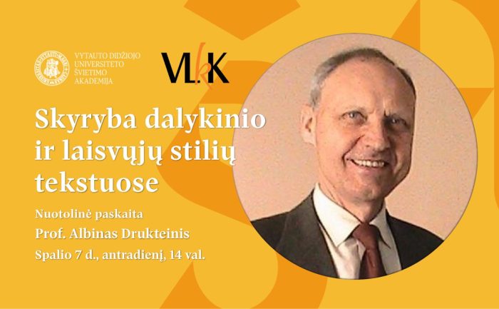 Spalio 7 d., antradienį, 14 val. vyks prof. Albino Drukteinio nuotolinė paskaita „Skyryba dalykinio ir laisvųjų stilių tekstuose“.