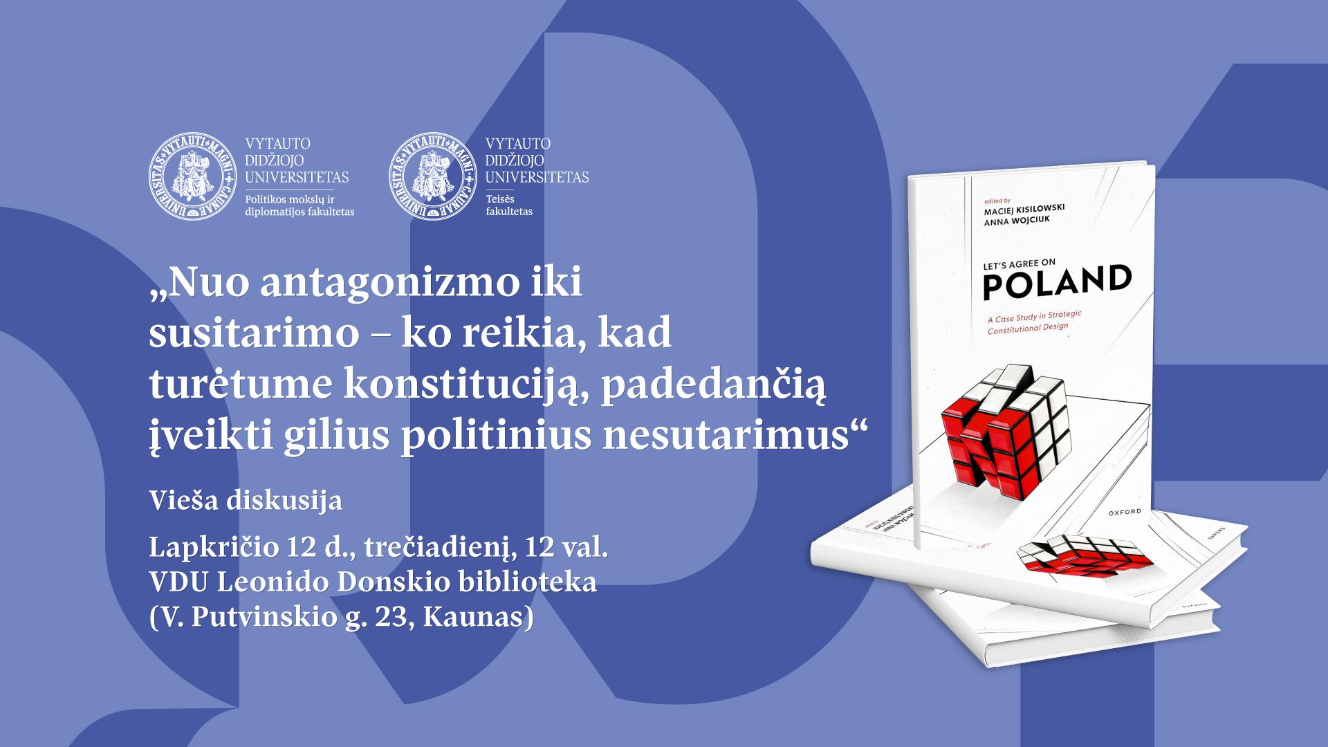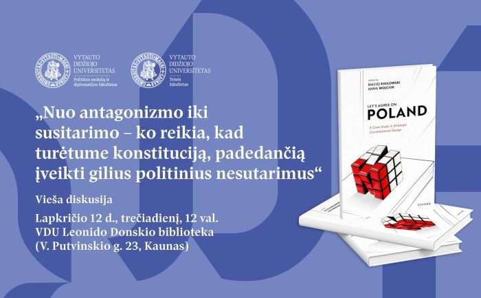 Lapkričio 12 d., trečiadienį, 12 val. VDU Leonido Donskio bibliotekoje (V. Putvinskio g. 23) vyks VDU Politikos mokslų ir diplomatijos ir Teisės fakultetų diskusija „Nuo antagonizmo iki susitarimo – ko reikia, kad turėtume konstituciją, padedančią įveikti gilius politinius nesutarimus“.