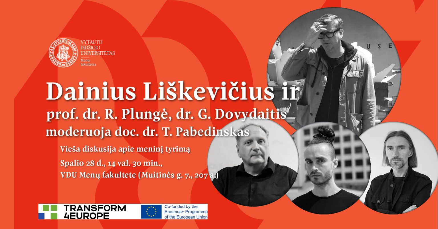 VDU Menų fakultetas kviečia į viešą diskusiją apie meninį tyrimą. Jos metu Fakulteto dėstytojai prof. Rimantas Plungė, dr. Gytis Dovydaitis ir kviestinis diskusijos svečias menininkas Dainius Liškevičius sieks ne tik teoriškai apibendrinti meninio tyrimo sąvoką, bet ir ieškos atsakymų į praktinius klausimus, kaip meninis tyrimas suprantamas Universitete, kaip taikomas studijų procese, kokie meninio tyrimo metodai naudojami. Bus paliesti ir platesni Lietuvos aukštojo mokslo klausimai, bandant išsiaiškinti ar meninius tyrimus palaiko ir remia valstybė.