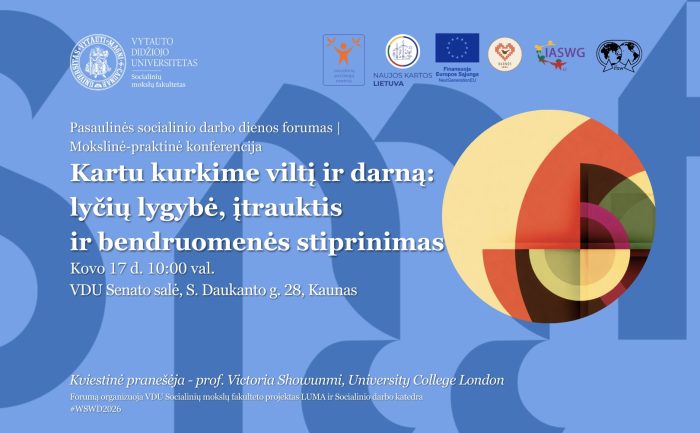 Vytauto Didžiojo universiteto Socialinių mokslų fakulteto Socialinio darbo katedra ir projektas LUMA kviečia į forumą, mokslinę-praktinę konferenciją „Kartu kurkime viltį ir darną: lyčių lygybė, įtrauktis ir bendruomenės stiprinimas“, skirtą Pasaulinei socialinio darbo dienai minėti. Konferencija vyks 2026 m. kovo 17 d. 10–15 val. VDU senato salėje (S. Daukanto g. 28, Kaunas).