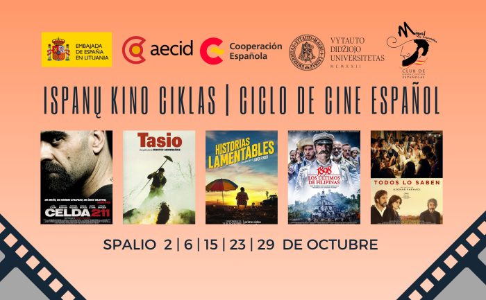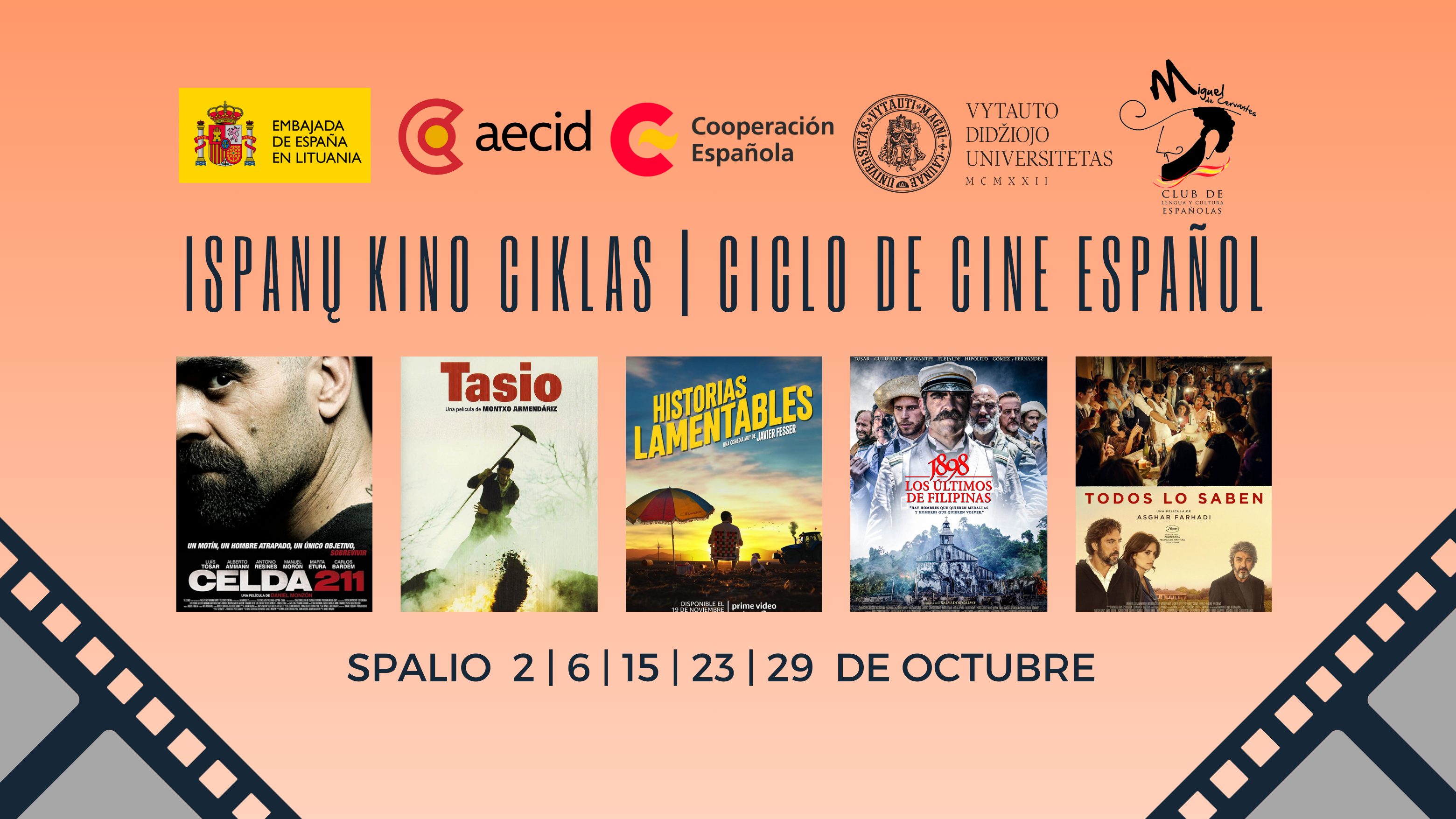 VDU ir Ispanijos Karalystės ambasada Lietuvoje jau ketvirtą kartą jungiasi prie šios iniciatyvos ir kviečia universiteto bendruomenę visą spalio mėnesį atrasti ispanišką kiną. Šiemet programoje laukia išskirtinė filmų įvairovė: nuo įtampos kupinos kalėjimo dramos „Celda 211“ (rež. Daniel Monzón, 2009) iki jautraus pasakojimo apie baskų kaimo gyvenimą „Tasio“ (rež. Montxo Armendáriz, 1984). Komedijų mėgėjams skirtas šiuolaikinis Javier Fesser filmas „Historias lamentables“ (2020), o istorijos gerbėjai galės iš naujo pažvelgti į kolonijinę praeitį filme „1898: Los últimos de Filipinas“ (rež. Fernando González Molina, 2016). Ciklą užbaigs psichologinė šeimos drama „Todos lo saben“ (rež. Asghar Farhadi, 2018), kurioje vaidina žymiausi Ispanijos aktoriai Penélope Cruz ir Javier Bardem.