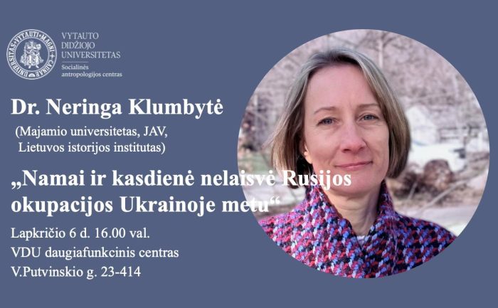 VDU Socialinės antropologijos centras kviečia į tiriamąjį seminarą „Namai ir kasdienė nelaisvė Rusijos okupacijos Ukrainoje metu“, kurį ves dr. Neringa Klumbytė (Majamio universitetas, JAV, Lietuvos istorijos institutas).