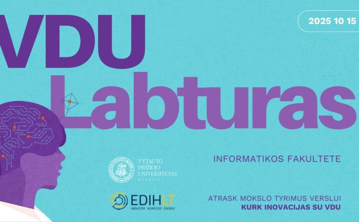Vytauto Didžiojo universitetas (VDU) kviečia verslo ir viešojo sektoriaus atstovus į pažintinį renginį „VDU labturas: atrask skaitmenizacijos galimybes verslui“. Jo metu universiteto svečiai turės galimybę susipažinti su VDU Informatikos fakultetu ir jame dirbančiais mokslininkais bei padiskutuoti apie mokslo ir verslo bendradarbiavimą, VDU kuriamas inovacijas, atliekamus tyrimus, vykdomus projektus, finansavimo pritraukimą ir kitas paslaugas verslui bei viešajam sektoriui.