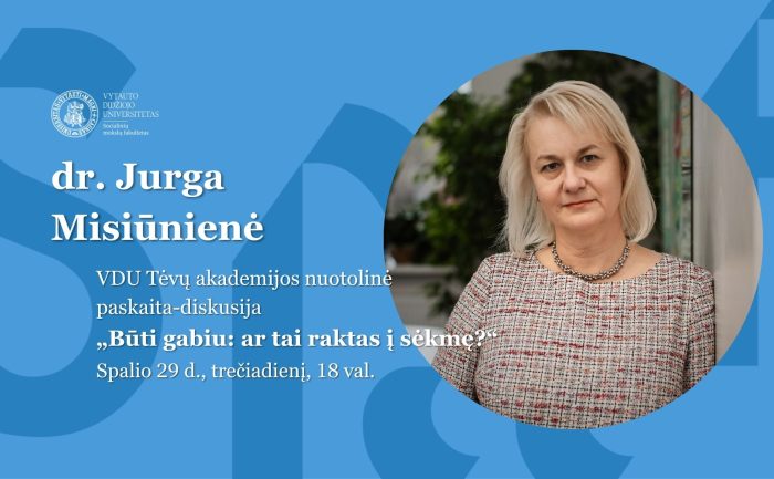 Mano vaikas yra gabus. Ką tai iš tiesų reiškia? Jei tai dovana (angl. giftedness), tai ar mano vaiko tikrai laukia sėkmė? Ir kas gi ta sėkmė? Kuo galiu padėti? Kartu paieškoti atsakymų į šiuos ir kitus klausimus, kylančius tėvams, siekiantiems sudaryti sąlygas maksimaliai vaiko gebėjimų raiškai, kviečia VDU Psichologijos katedros lektorė, VDU ,,Gifted“ centro psichologė dr. Jurga Misiūnienė.
