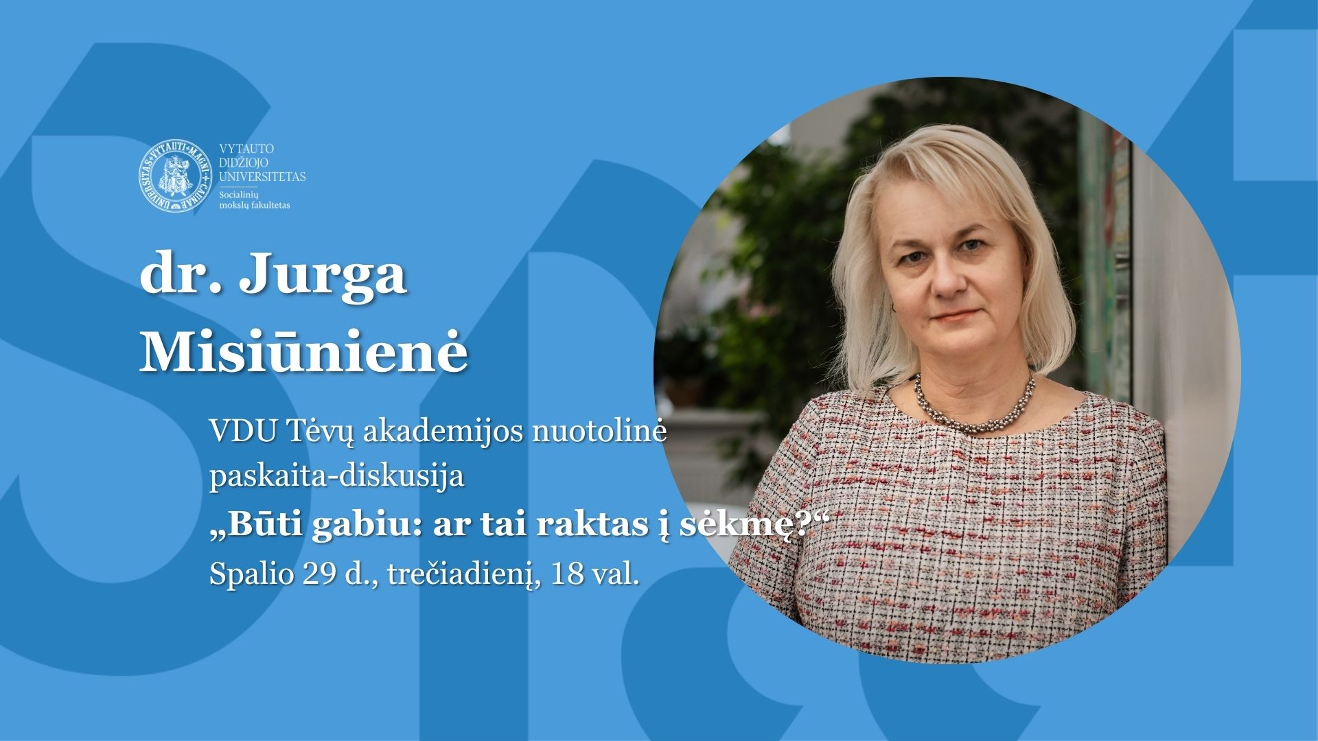 Mano vaikas yra gabus. Ką tai iš tiesų reiškia? Jei tai dovana (angl. giftedness), tai ar mano vaiko tikrai laukia sėkmė? Ir kas gi ta sėkmė? Kuo galiu padėti? Kartu paieškoti atsakymų į šiuos ir kitus klausimus, kylančius tėvams, siekiantiems sudaryti sąlygas maksimaliai vaiko gebėjimų raiškai, kviečia VDU Psichologijos katedros lektorė, VDU ,,Gifted“ centro psichologė dr. Jurga Misiūnienė.