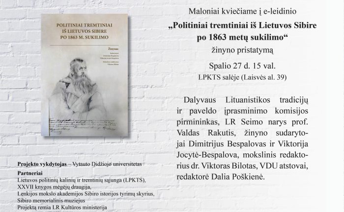 Spalio 27 d. 15 val. LPKTS salėje (Laisvės al. 39) maloniai kviečiame į e-leidinio „Politiniai tremtiniai iš Lietuvos Sibire po 1863 metų sukilimo“ žinyno pristatymą.