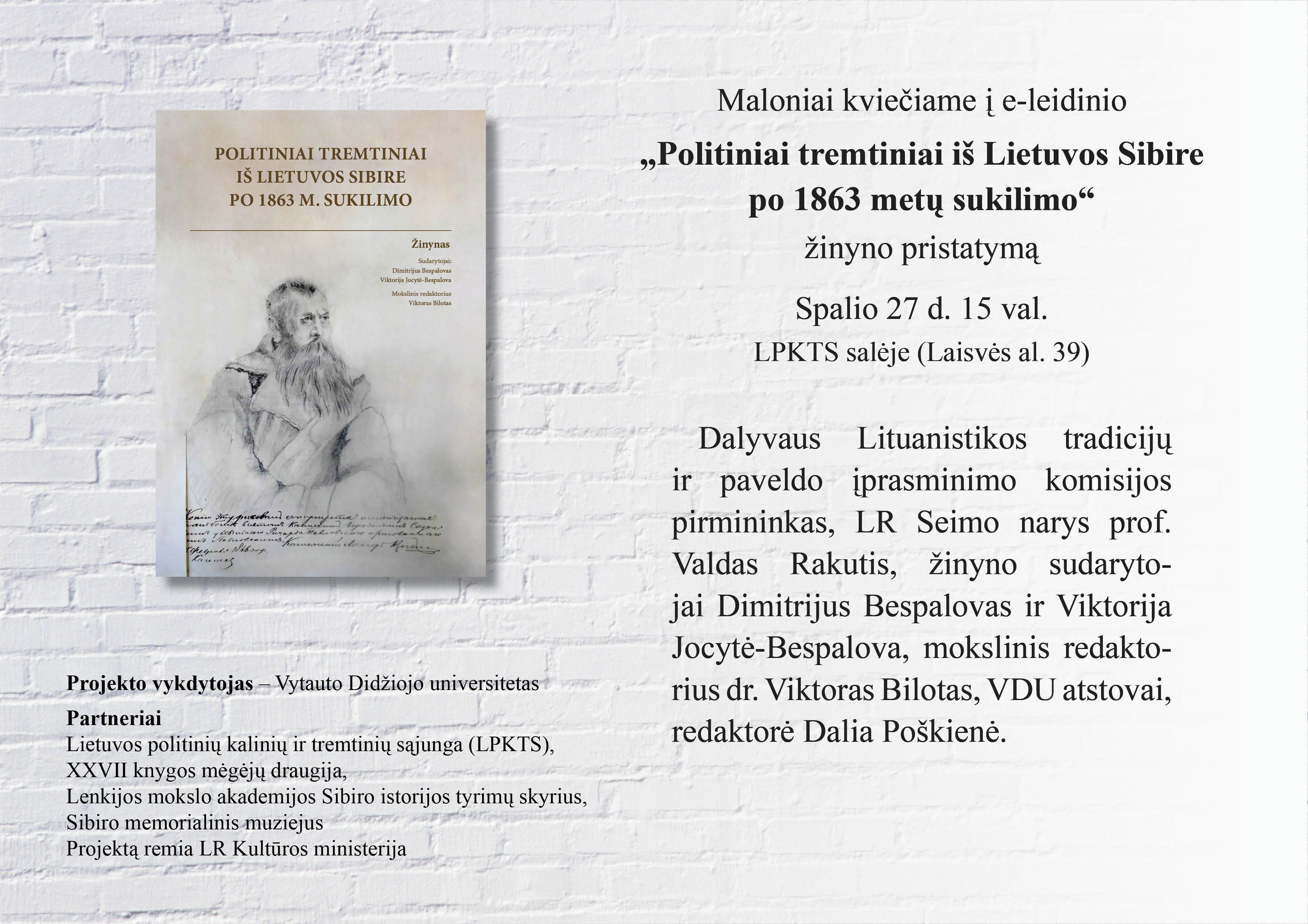 Spalio 27 d. 15 val. LPKTS salėje (Laisvės al. 39) maloniai kviečiame į e-leidinio „Politiniai tremtiniai iš Lietuvos Sibire po 1863 metų sukilimo“ žinyno pristatymą.