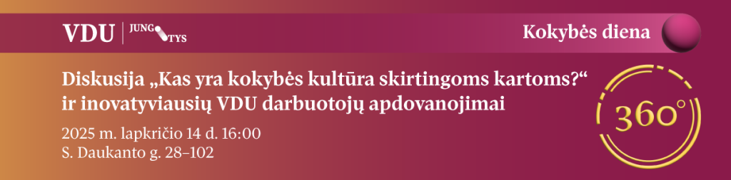 Lapkričio 14 d. 16.00 val. VDU Centriniuose rūmuose (S. Daukanto g. 28–102) kviečiame į gyvą, atvirą diskusiją „Kas yra kokybės kultūra skirtingoms kartoms?“, kur susitiks skirtingų kartų atstovai iš Universiteto bendruomenės ir išorės. Diskusijoje ieškosime atsakymų į šiuos ir kitus klausimus, o renginį vainikuos inovatyviausių VDU darbuotojų apdovanojimai, kurių metu pagerbsime tuos, kurie savo idėjomis, drąsa ir iniciatyvomis prisideda prie universitetinių studijų pažangos. Šiemet konkursui gauta daugiau nei pusšimtis paraiškų – tai rodo bendruomenės kūrybingumą ir atsidavimą kokybei.