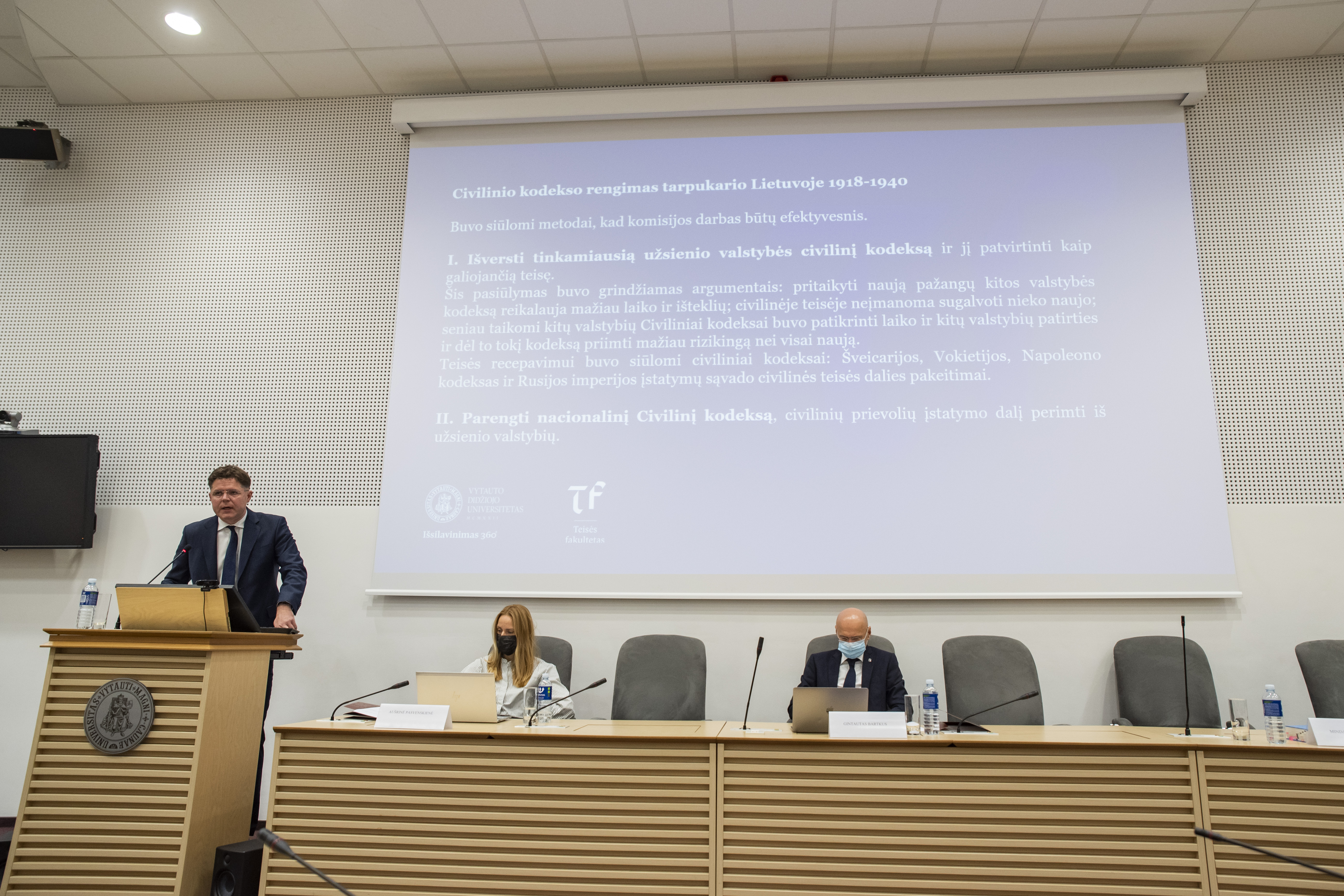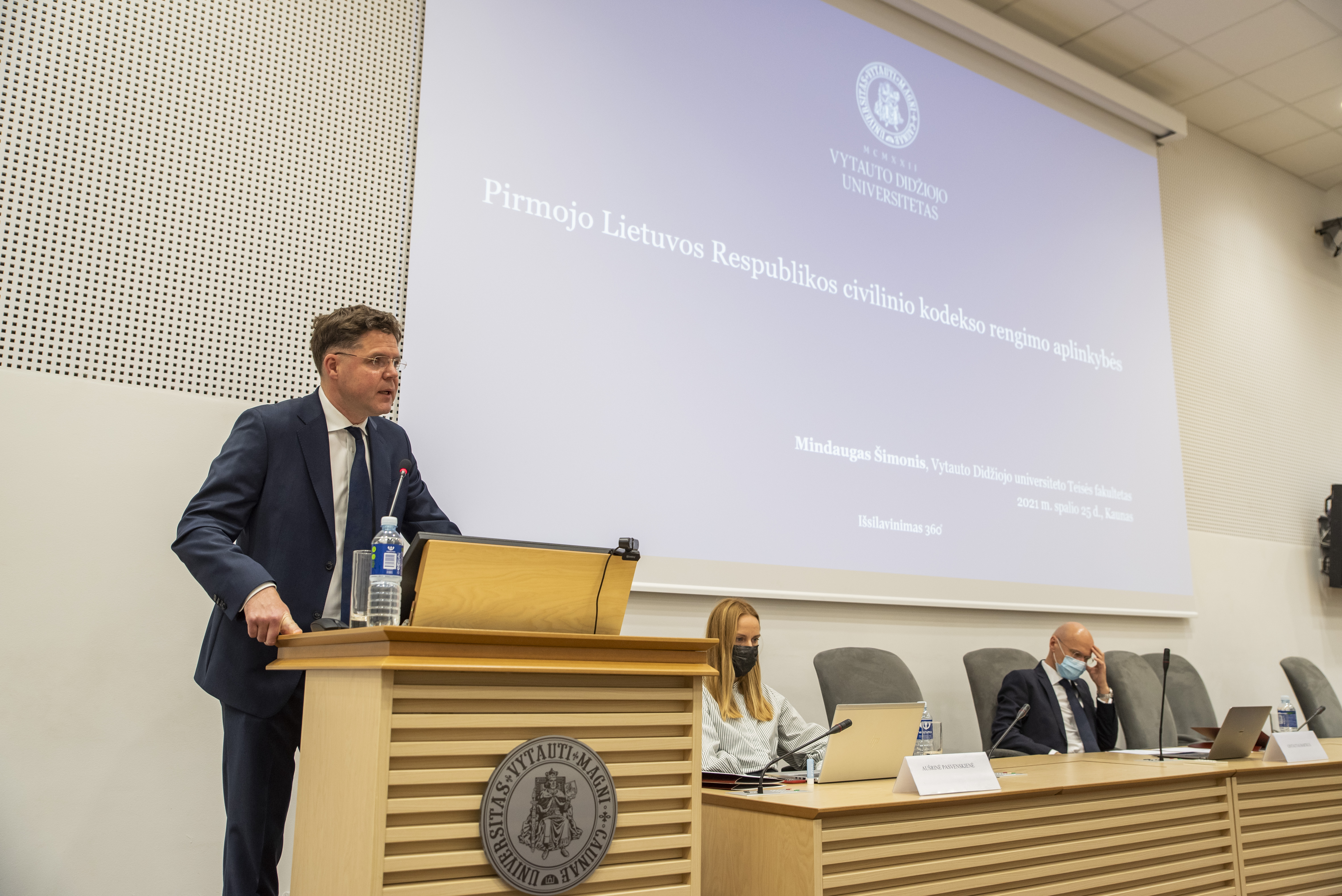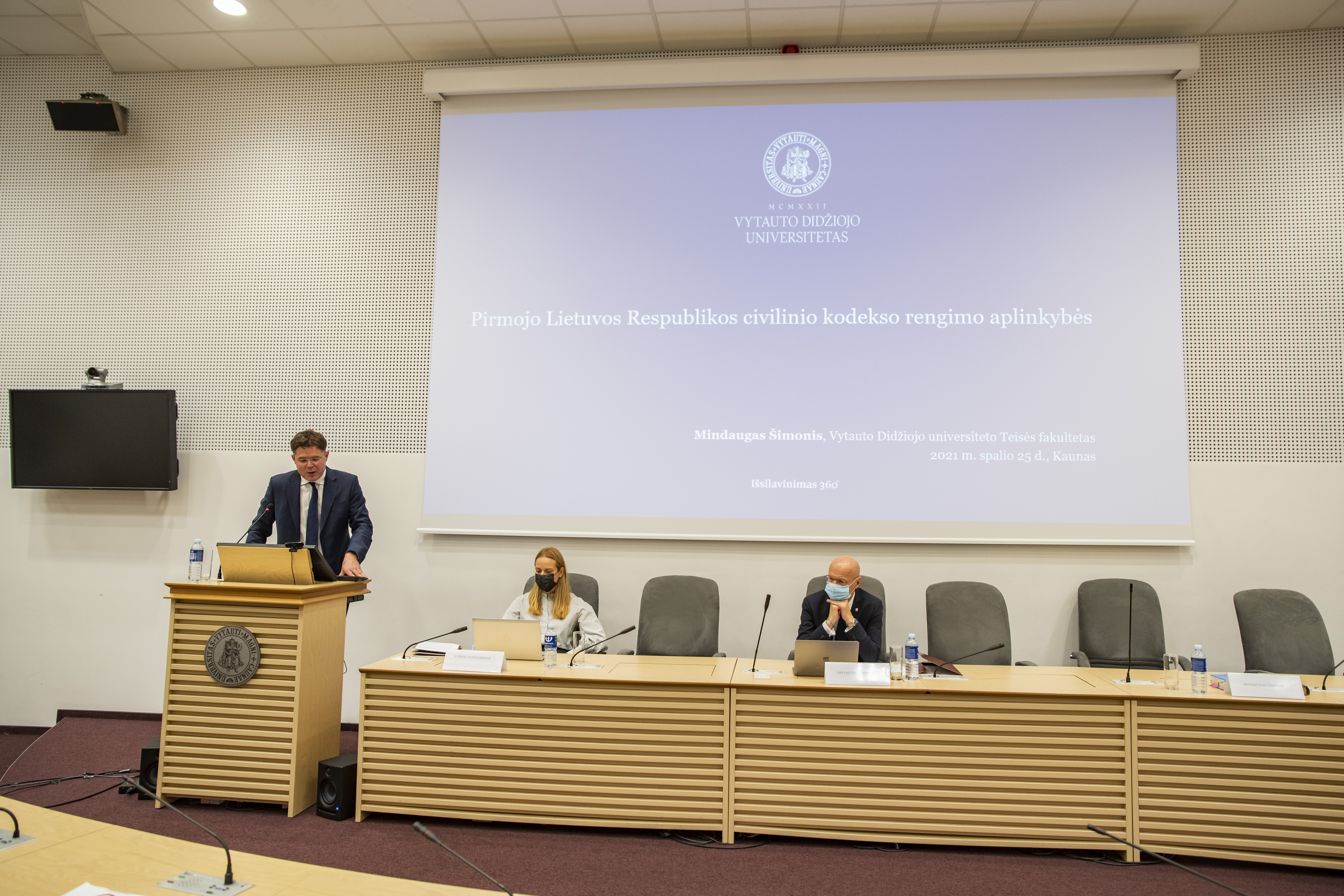 Vienas iš konferencijos organizatorių Mindaugas Šimonis, VDU Teisės fakulteto partnerystės docentas, advokatas, konferencijoje pristatė tarpukario Lietuvoje 1918-1940 metais rengto Civilinio kodekso aplinkybes ir priežastis, nulėmusias, kad kodeksas nebuvo baigtas rengti. Buvo pristatyti 1990-2000 metų įvykiai rengiant pirmąjį nepriklausomos Lietuvos istorijoje priimtą Civilinį kodeksą, kodekso projekto rengimo darbo grupių veikla, jo svarstymo, pateikimo ir priėmimo Lietuvos Respublikos Seime aplinkybės. Apibendrindamas atliktą tyrimą M. Šimonis pažymėjo Civilinio kodekso rengimo darbo grupės narių, ir ypatingai darbo grupės vadovo profesoriaus Valentino Mikelėno ir buvusio teisingumo ministro Gintauto Bartkaus išskirtinę reikšmę ir istorinį vaidmenį, kad Lietuva pirmą kartą savo istorijoje turi materialiai kodifikuotą civilinę teisę, modernų ir lankstų Civilinį kodeksą.