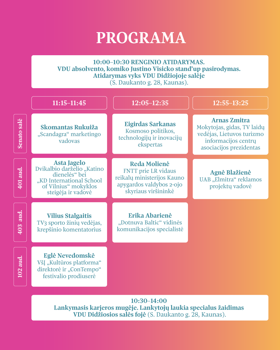 Renginys vyks lapkričio 14 d., 10.00–14.00 val., Vytauto Didžiojo universiteto centriniuose rūmuose (S. Daukanto g. 28, Kaunas).