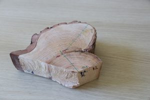 Pokalbio metu profesorius Ch. Ruffner pademonstravo vieną iš mėginių – ugnies pažaidos plokštelę, t. y. gabaliuką medžio, mėginį, paimtą iš gyvo medžio. Profesorius paaiškino: „Medis vis dar gyvas, bet pažiūrėję į mėginį, galime pastebėti negyvą vietą. Šiuo atveju gaisras įvyko 1947 metais, bet viso medžio nepražudė. Žuvo tik tam tikra augančio audinio dalis. Bėgant laikui, medis gyja ir auga, o žaizda atsiduria po naujais sluoksniais. Pagal šią ugnies pažaidą ir tris rieves galite sužinoti, kas vyko miške gaisrų ir klimato aspektu. Medžiai – puikūs pasakotojai. Istorija rašoma jų rievėse. O visa tai datavus, galima išsiaiškinti, koks yra gaisrų sezoniškumas, santykinis gaisrų dažnis. Taip pat galima nustatyti, ar tai lėmė klimatas, ar žmogaus veikla.“