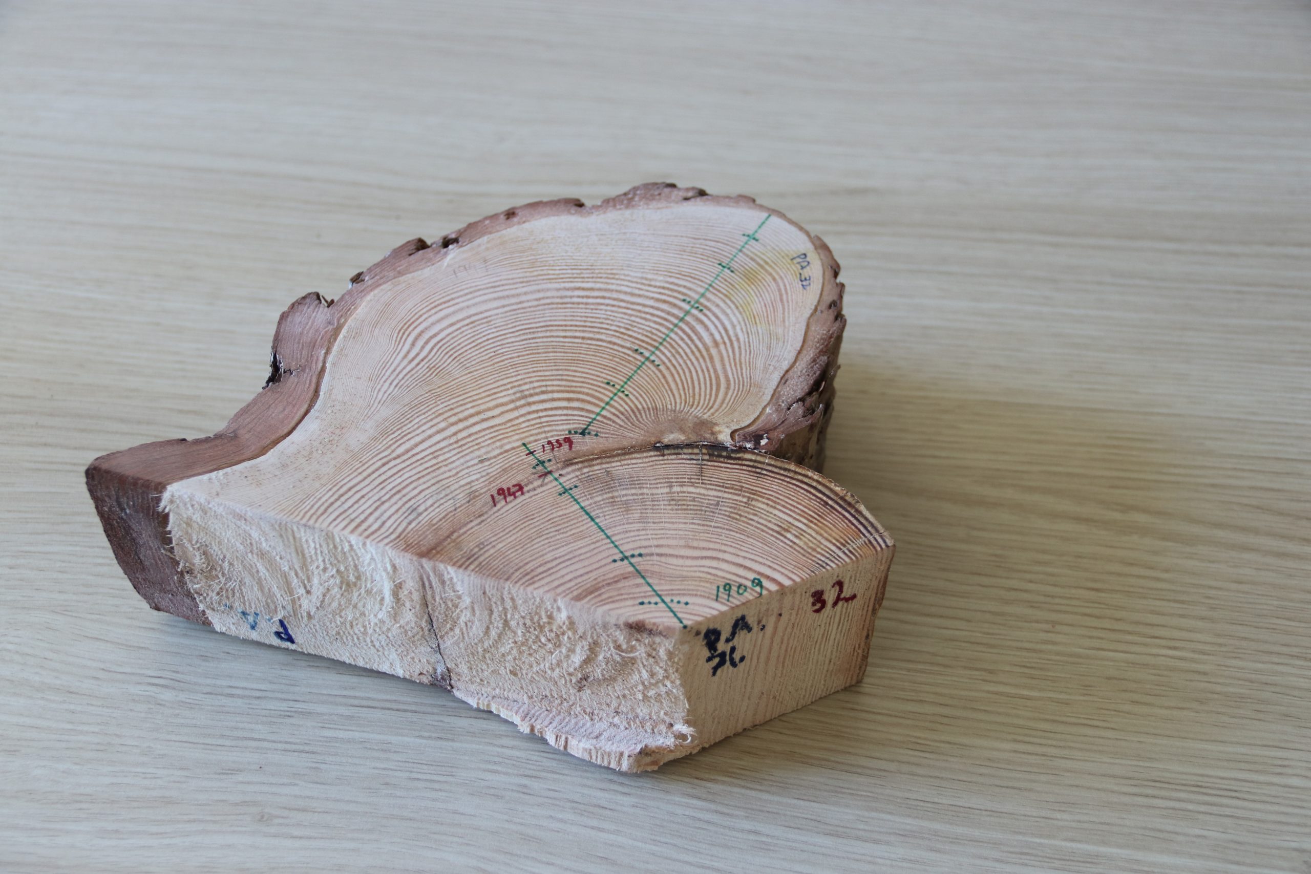 Pokalbio metu profesorius Ch. Ruffner pademonstravo vieną iš mėginių – ugnies pažaidos plokštelę, t. y. gabaliuką medžio, mėginį, paimtą iš gyvo medžio. Profesorius paaiškino: „Medis vis dar gyvas, bet pažiūrėję į mėginį, galime pastebėti negyvą vietą. Šiuo atveju gaisras įvyko 1947 metais, bet viso medžio nepražudė. Žuvo tik tam tikra augančio audinio dalis. Bėgant laikui, medis gyja ir auga, o žaizda atsiduria po naujais sluoksniais. Pagal šią ugnies pažaidą ir tris rieves galite sužinoti, kas vyko miške gaisrų ir klimato aspektu. Medžiai – puikūs pasakotojai. Istorija rašoma jų rievėse. O visa tai datavus, galima išsiaiškinti, koks yra gaisrų sezoniškumas, santykinis gaisrų dažnis. Taip pat galima nustatyti, ar tai lėmė klimatas, ar žmogaus veikla.“