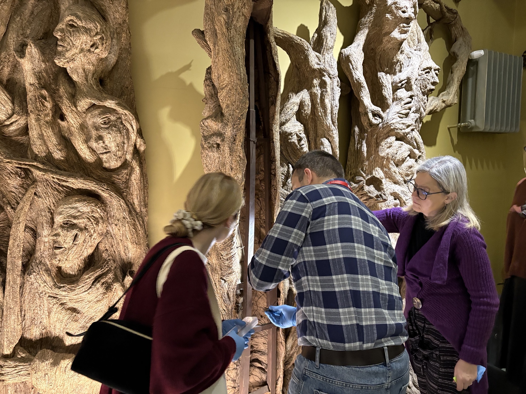 VDU ŽŪA dokt. I. Kavaliauskienė ir Nacionalinio M. K. Čiurlionio dailės muziejaus darbuotojai ima DNR pavyzdžius iš skulptūros vidinės dalies / D. Danusevičiaus nuotr.