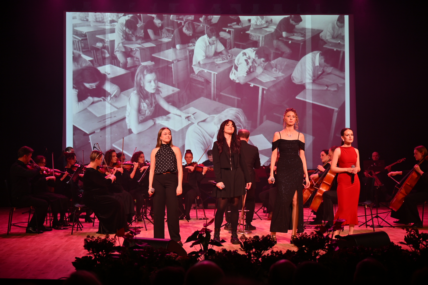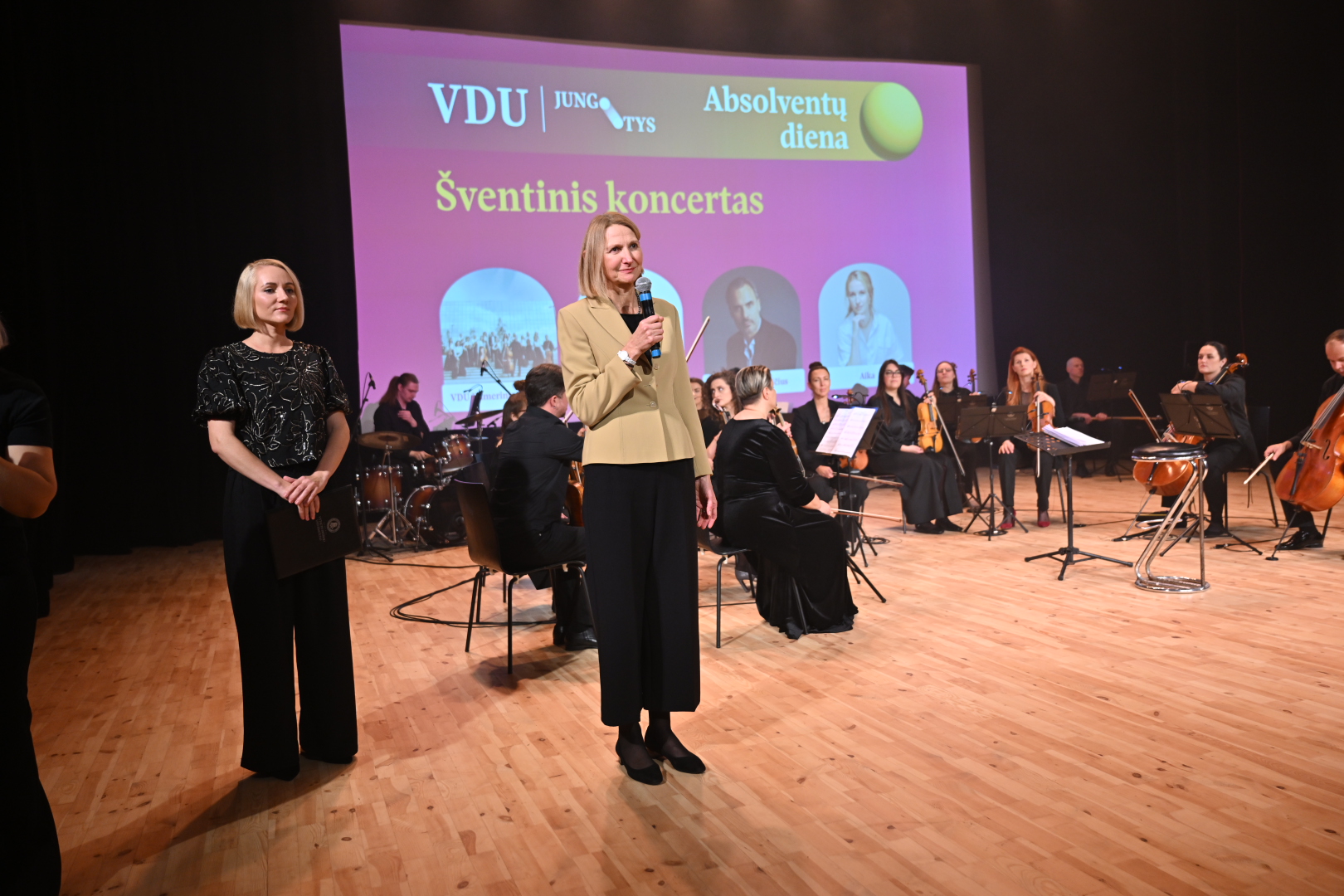Absolventų dienos vakarinėje programoje – visai universiteto bendruomenei skirtame šventiname VDU Kamerinio orkestro ir VDU Muzikos akademijos dėstytojo, atlikėjo Manto Jankavičiaus bei jo kuruojamos klasės solistų koncerte skambėjo populiariausios dainos nuo VDU atkūrimo pradžios iki šiandienos.