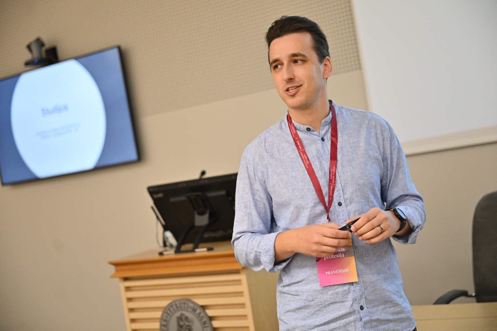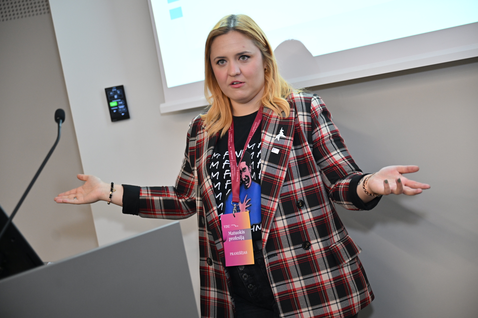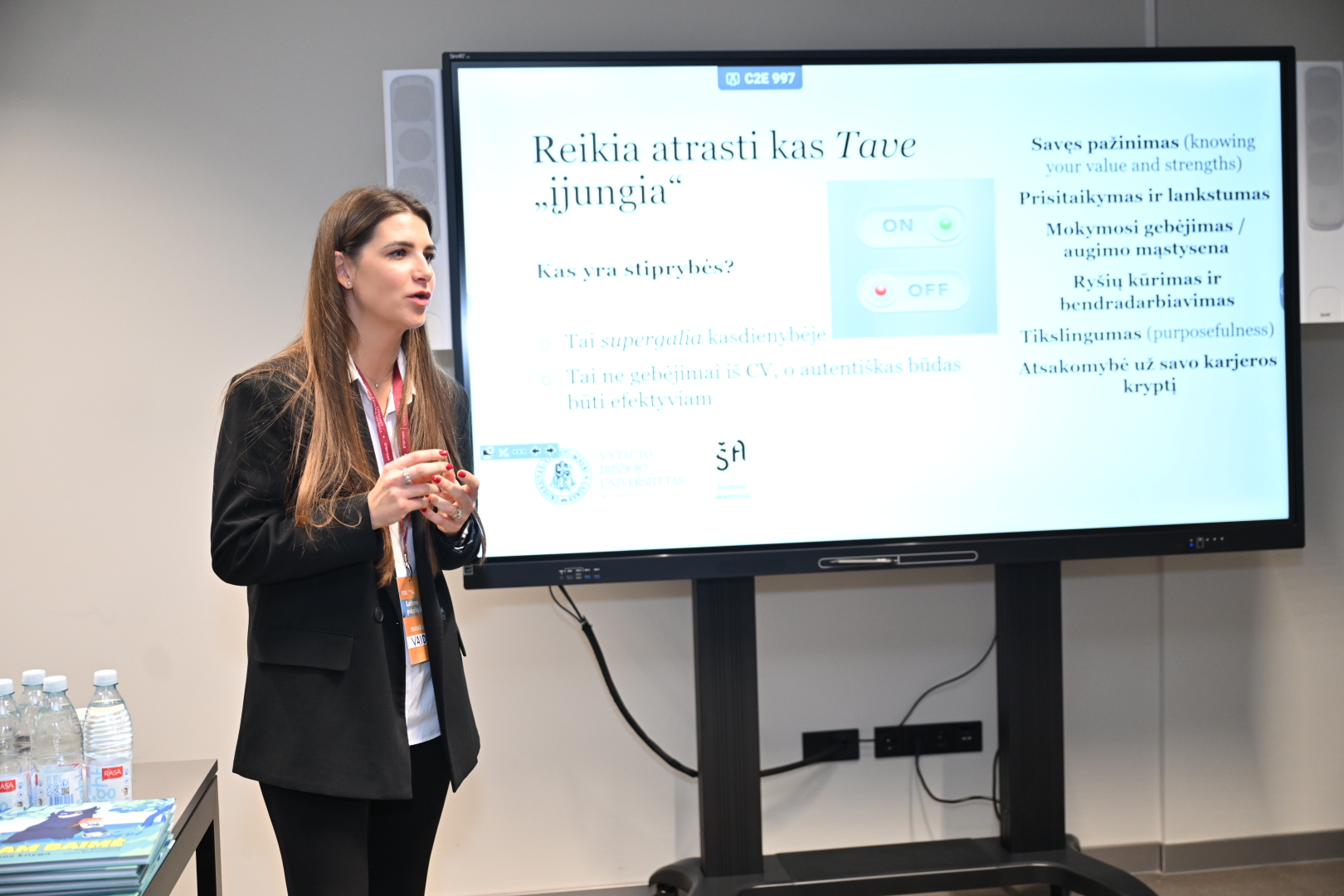 Viešąją komunikaciją VDU studijavęs sporto žurnalistas gausiai į auditoriją susirinkusiems moksleiviams prisipažino šią studijų programą pasirinkęs paskutinę sekundę – kaip juokauja, nes nereikėjo matematikos egzamino, tačiau iki šiol nesigailintis.