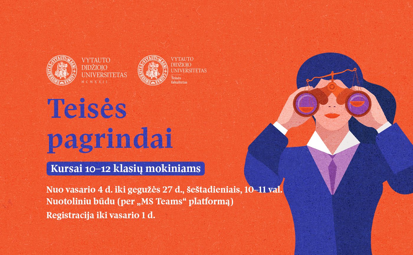 Vytauto Didžiojo universiteto (VDU) Teisės fakultetas kviečia bendrojo lavinimo mokyklų 10-12 klasių mokinius dalyvauti nemokamuose universitetiniuose kursuose „Teisės pagrindai“, kuriuose moksleiviai galės susipažinti su visomis pagrindinėmis teisės šakomis ir teisine sistema.