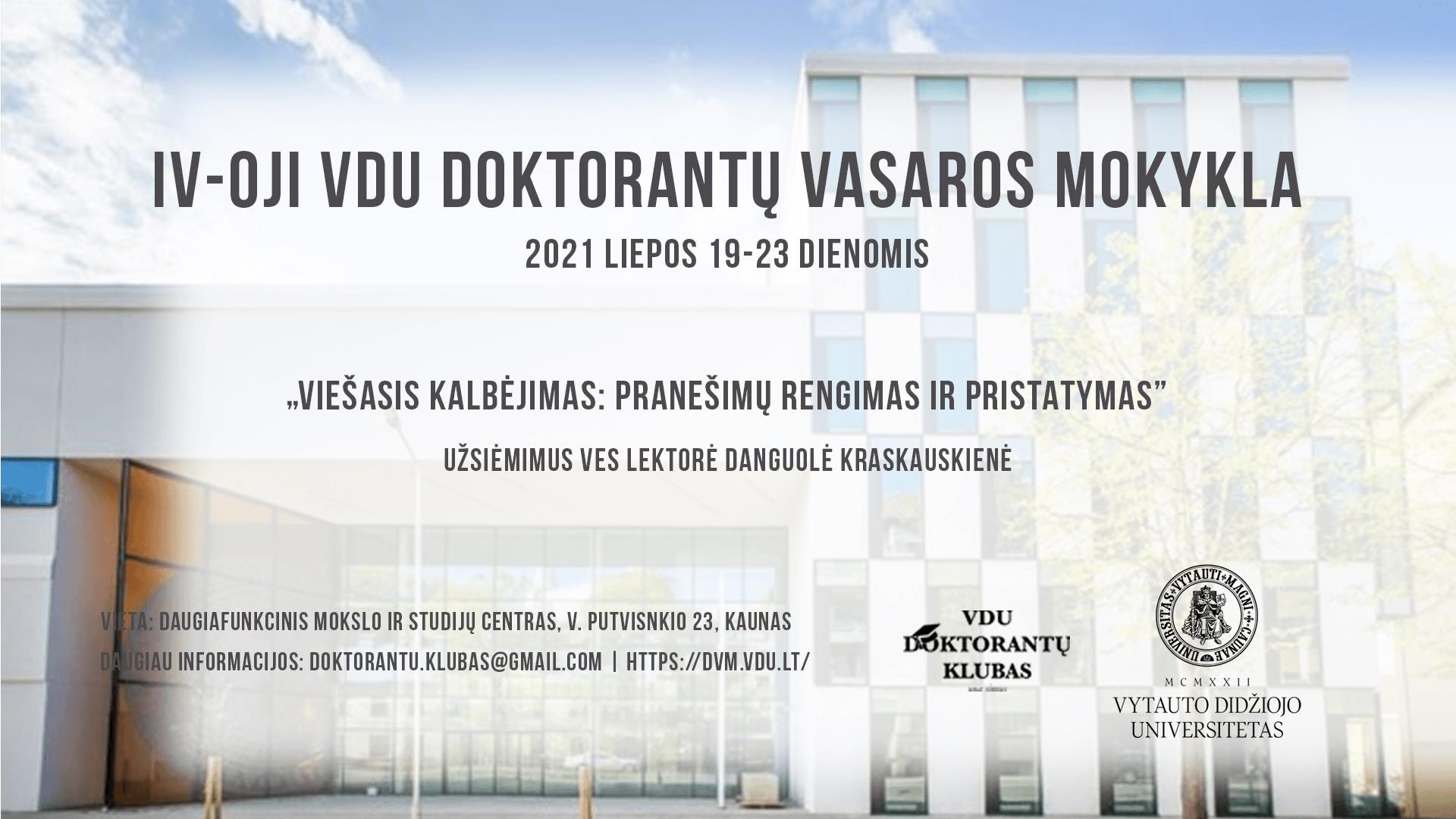 Vytauto Didžiojo universiteto (VDU) Doktorantų klubas kviečia dalyvauti IV-oje doktorantų vasaros mokykloje, kuri vyks 2021 m. liepos 19–23 d. Vytauto Didžiojo universitete.